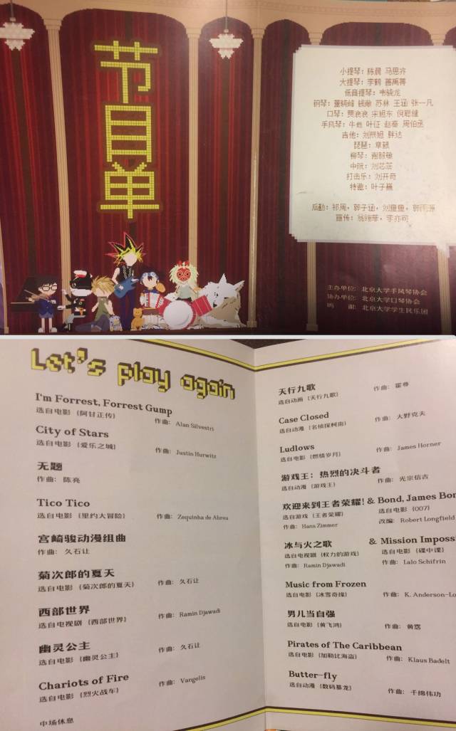 除去个别常来的商业演出,我在北大期间并没有听过类似主题的音乐会。至于游戏王、王者荣耀或室内乐版Butter-fly等等这类非常规的演出曲子,或许可以自夸是进行了“首演”的尝试。但更重要的是我们可以把它分享给更多的爱好者,并且在其中一起收获用音乐寻找美好记忆的乐趣。