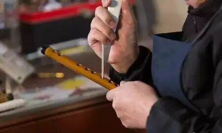 【其二】,王老师一直在沿用的打孔工艺都是最早流传下来烫孔工艺,此工艺保留了最原始的技术。在现代,这样的工艺早已被机器给代替,先是机器大致打孔,再者手工调音,这样确实又快又便捷。但从最初的来看,笛子开孔的方向就不一样了。挖孔是用笛刀从内部往外挖,而用火热的金属烫孔,必然使得笛孔成喇叭口。这样的孔,其实科学度没有现代的高,但王老师能完美的结合,就是因为第三点吧。