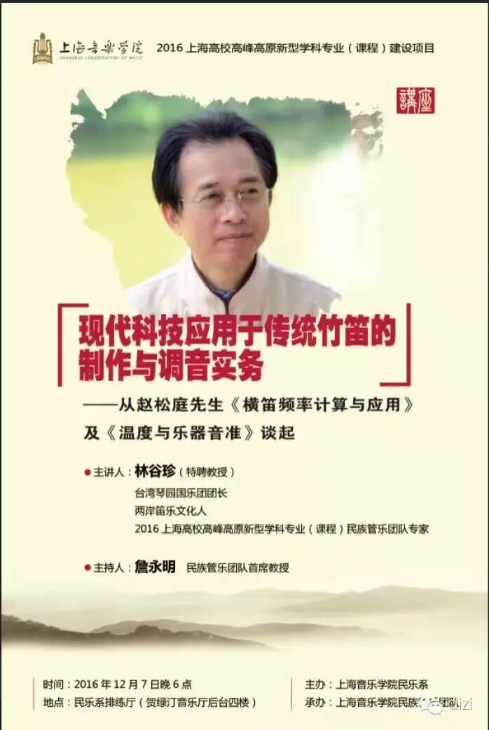 据悉,2016上海高峰高原新型课程建设民族管乐团队柔性引进专家特聘教授、台湾琴园国乐団长、两岸笛乐文化交流使者林谷珍先生将于2016年12月7日晚6点上海音乐学院民乐系排练厅主讲“《现代科技应用于传统竹笛的制作与调音实务》—从赵松庭先生《横笛频率计算与应用》及《温度与乐器音准》谈起”专题讲座,将由著名笛子演奏家、上海音乐学院教授詹永明主持。精彩可期,欢迎大家光临。
