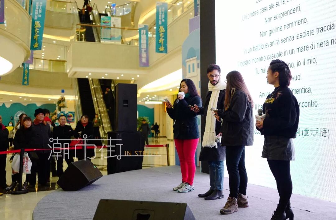 在浙大海宁国际校区就读的巴西留学生法拉、意大利留学生罗科和罗马尼亚留学生西扎拉带来了国际版的徐志摩诗歌《偶然》的朗诵(用葡萄牙语、意大利语、罗马尼亚语朗诵)。