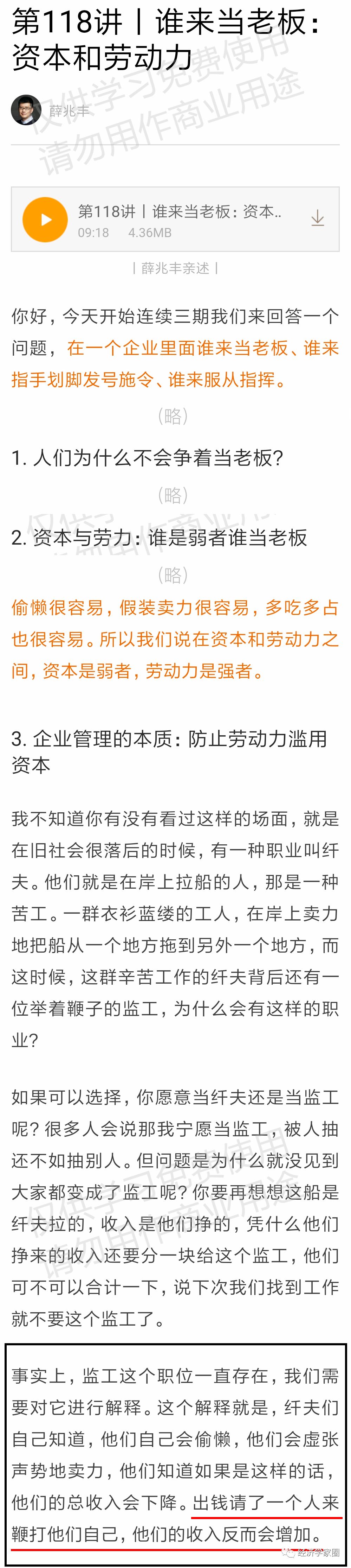 我们再来看看薛兆丰的课程,不仅仅是薛兆丰,网络搜索可以发现,这一案例被误用的太多太多了。比如中央财经大学的李燕和王威的文章《民主文化下的财政监督:从参与到治理》也提到“这就是为什么张五常教授观察到,当年三峡上的纤夫会雇用一个监工来抽打他们自己这一看似不合常理的情况。 ”