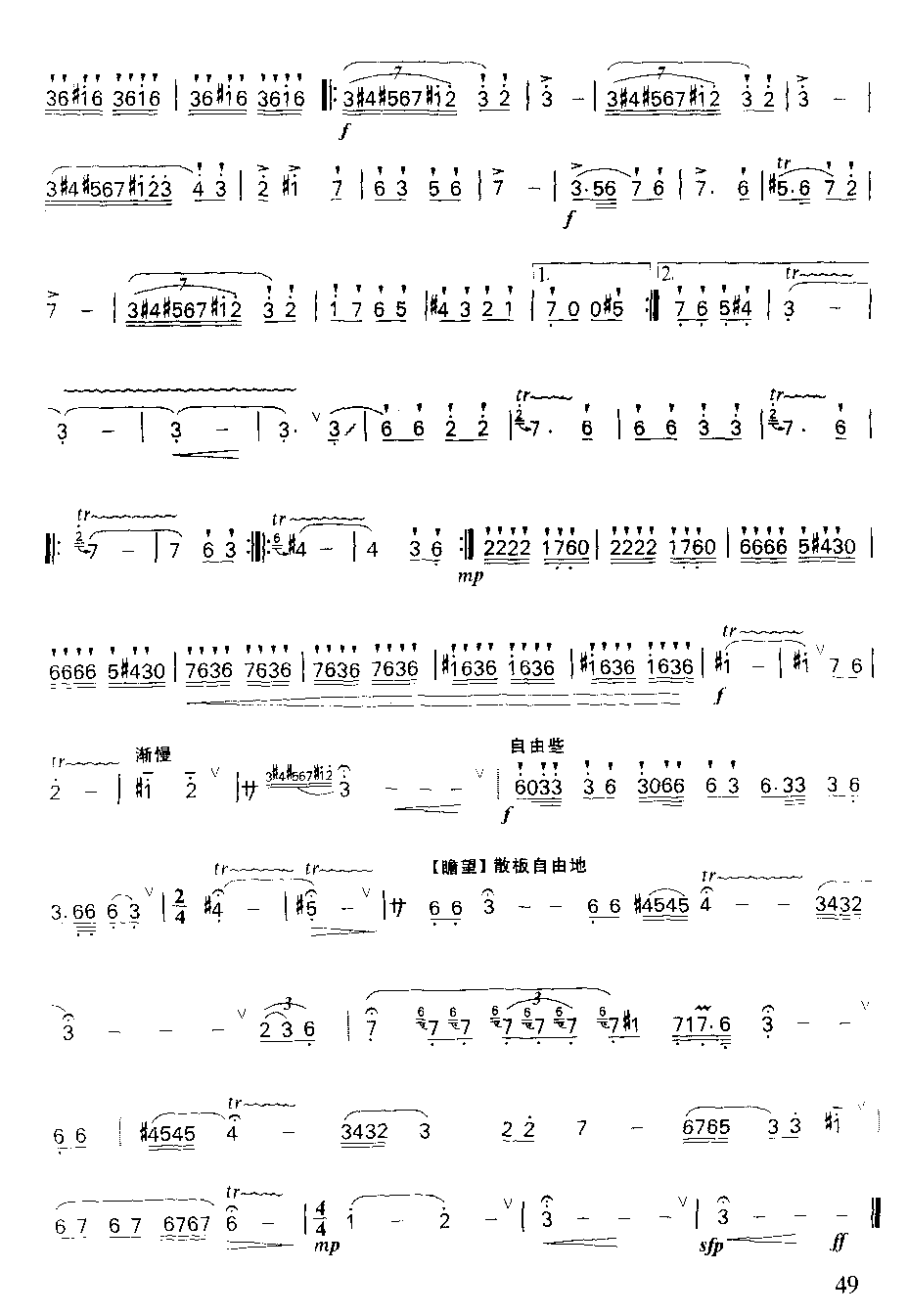 全曲分为引子、中板、快板、尾声四部分,G调,可用E调笛筒音作3演奏。引子与尾声均为散板,节奏自由,意境悠远,可充分发挥艺术的想象,辽阔而酣畅地抒情。中板也一样,舒展深情,有憧憬有遐想,更有哲理般的思索。快板欢快喜悦,十分富有活力,好似通过对美好生活的向往,化为充满活力的实干,同时展示了克服征途困难的必胜信心。