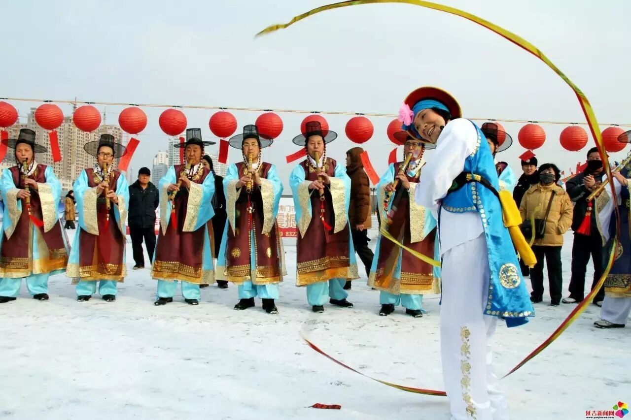 作品:中国朝鲜族民俗表演——象帽舞 内容:2012年2月6日,延吉市市民通过各种民俗表演庆祝元宵节,象帽舞背景一排表演者正在吹朝鲜族特有乐器洞簫。