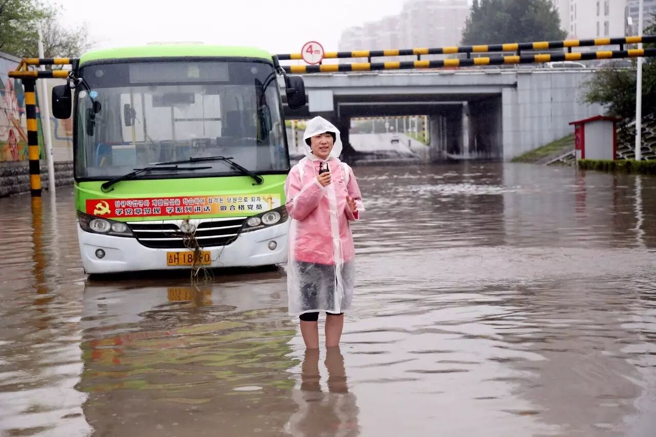 作品:最美女记者 内容:2016年8月30日,台风“狮子山”过境延边。延吉电视台美女记者在洪水中作现场报道。