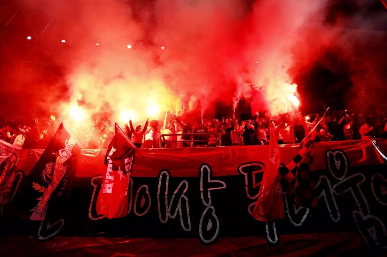 作品:热情似火 内容:2016年10月26日,延边富德2:0胜石家庄永昌,球迷点燃焰火庆祝保级成功 李军广 摄