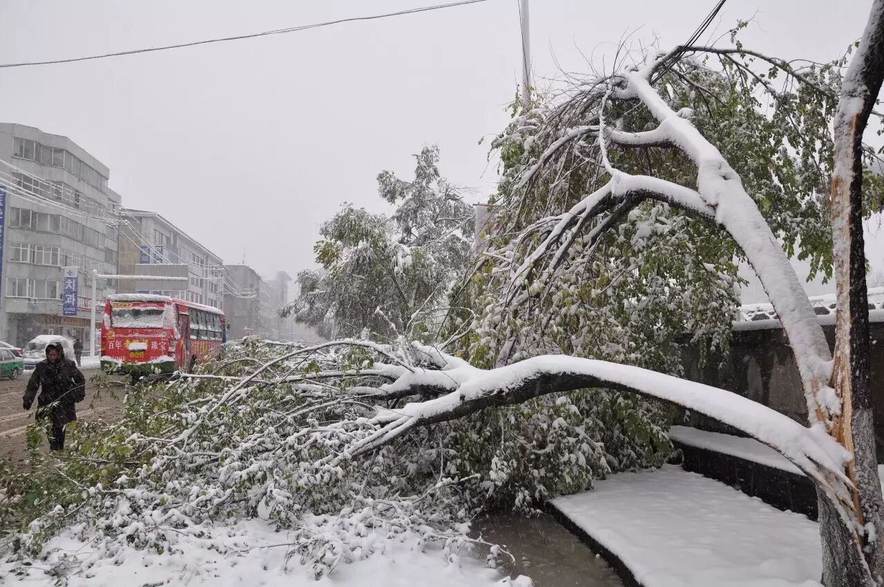 作品:雪灾 内容:2009年10月31日,树叶未落,延吉市普降暴雪,雪灾造成大量树木损坏。