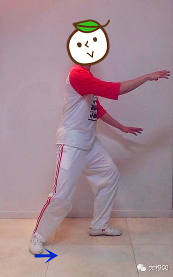 右脚上半步后,一个常见错误就是脚尖呈90度外摆,这个错误的方向会导致接下去重心后移的不便。正确动作应当是脚尖向斜前方45度。