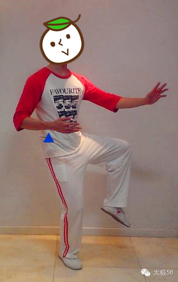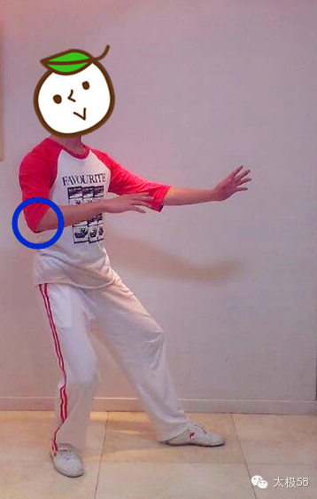 前文中多次提到,太极拳应当以腰为中轴,用腰带动手臂的运动。上图中腰还没转到位,肘已后撤过多,且过早旋臂,应当保持腰与手臂的同步运动。