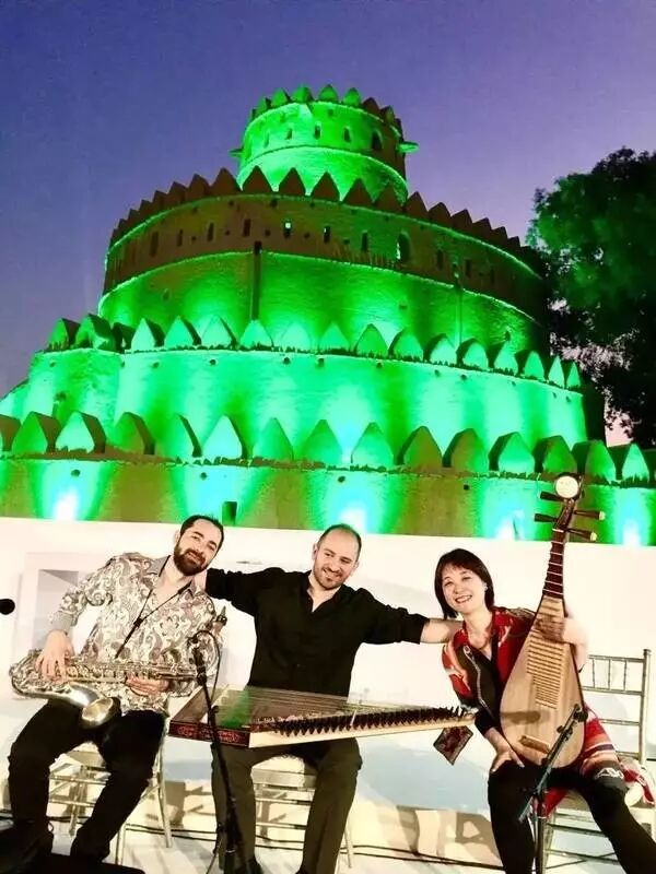 从左至右,、意大利手鼓演奏家都塔尔 安德烈、、中国杭州琵琶演奏家吴蛮、塔吉克斯坦塔尔演奏大师Sirojiddin
