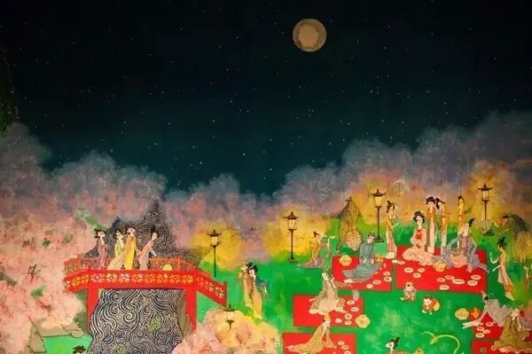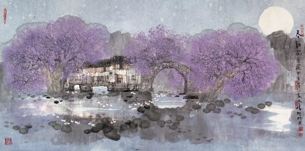 第二、三段,表现了"月上东山"和"风回曲水"的意境。 接着如见江风习习,花草摇曳,水中倒影,层迭恍惚。