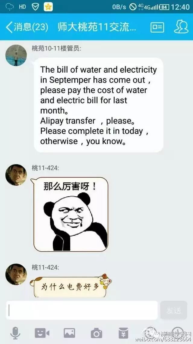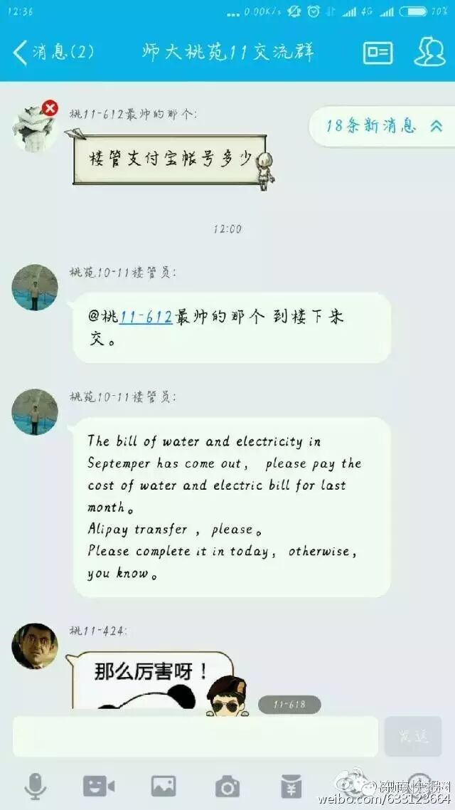 半个多月前,师大桃苑宿舍楼的一位楼管叔叔也火了!他在宿舍群里用英语(请注意:是用英语……)提醒同学们及时缴纳水电费,和同学的一回一答,英语全程亮了!