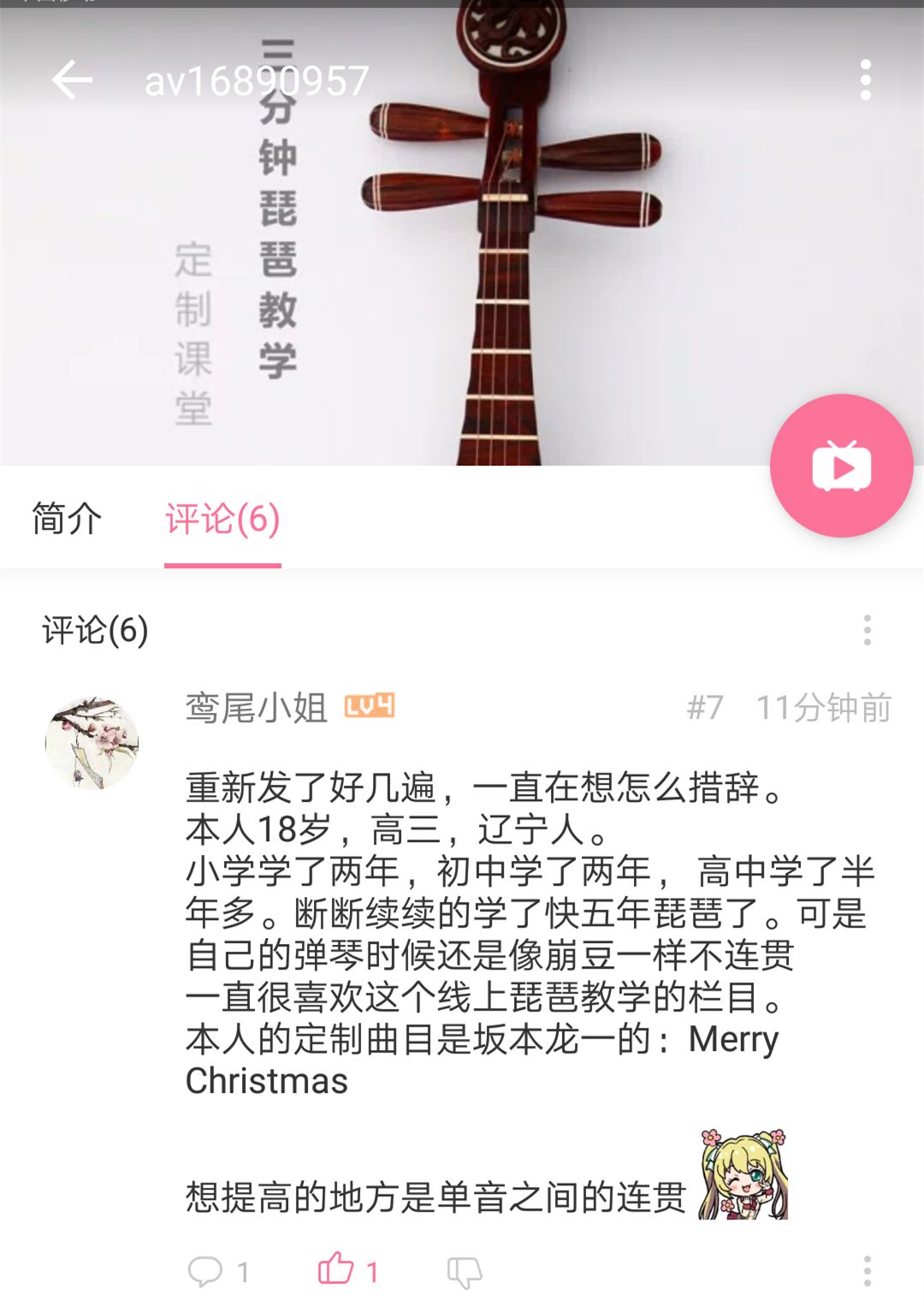 此次课程为【三分钟琵琶教学】线上课堂-鸾尾小姐定制课堂;该位幸运baby来自B站(哔哩哔哩网站)。