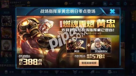 现在只要登陆王者荣耀就可以看到新英雄黄忠上线的海报了,不过上面只写了黄忠的点券价格,而且现在去商城是买不到这个英雄的。那么黄忠什么时候可以买?除了点券还能怎么买?多少金币?琵琶网小编给大家一一解答一下。