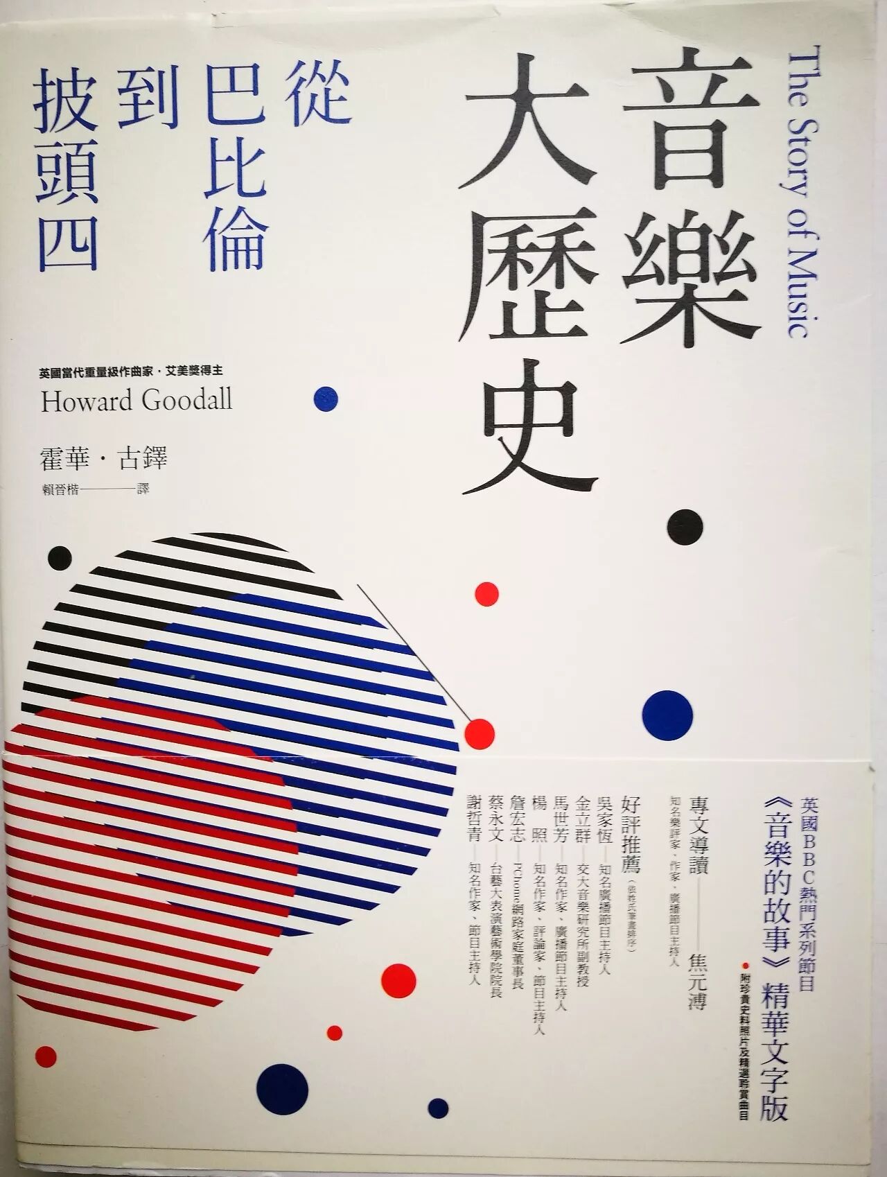 《音乐大历史》这本书,我是在香港买的,中文翻译看着有点累,翻译得太生硬。英文原版文字生动活泼。该书在youtube上有BBC制作的英文纪录片,分很多集,比看书好要多了。作者howard Goodall是英国职业作曲家和音乐学者,如此博学和有思想,很是难得。他因为制作了纪录片《音乐大历史》而在全世界出名,在片中和书中,他全面,博古通今地讲述了音乐的起源、变化、创作,演奏,欣赏,音乐的过去和今天。谁把这本书或他的这个纪录片看透彻了,一定可以称为一个准专家级别的音乐鉴赏家。