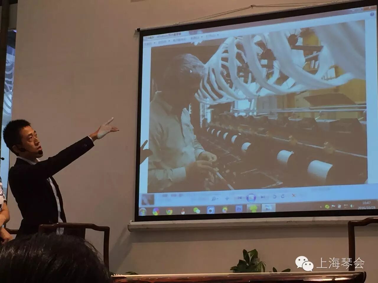 讲座由琴会的副会长沈正国先生主持,来自日本的桥本英宗先生通过照片演示的形式向大家展示了丝弦制作的具体步骤与全过程。丸三家族从110年前就开始制作蚕丝乐器弦,历经四代,积累了丰富的经验。近年来,丸三丝弦开始尝试制作中国的古琴弦,在长期的探索与实践中亦取得了一定成就。