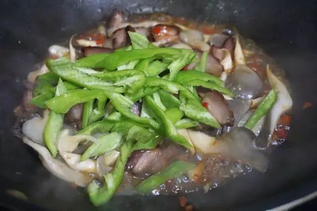 8、最后放入尖椒段,翻炒均匀后尝尝味道,酌情放糖或盐。