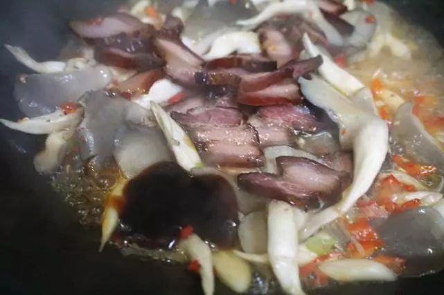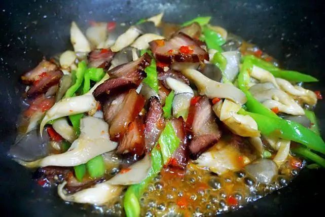 7、接着放入腊肉,适量蚝油,翻炒均匀等2分钟,这时候炒锅里平菇析出的水分会比较多,建议中火盖盖子焖。