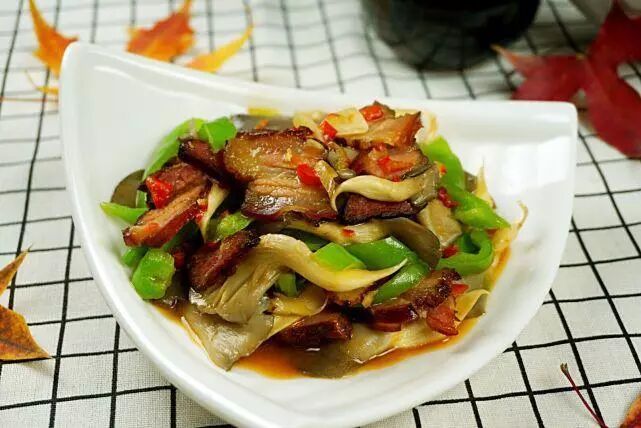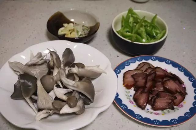 食材:平菇300克、腊肉150克、尖椒2根、剁辣椒2大勺、葱末蒜片适量、食用油、糖、料酒、蚝油