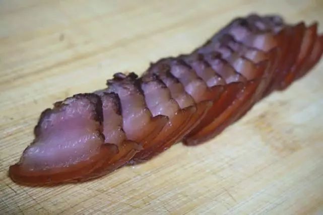 2、买来的腊肉,做如下处理:锅内放入清水煮沸,放入适量的腊肉条,中火煮25分钟。然后取出来切均匀薄片。
