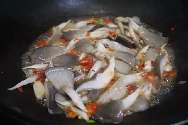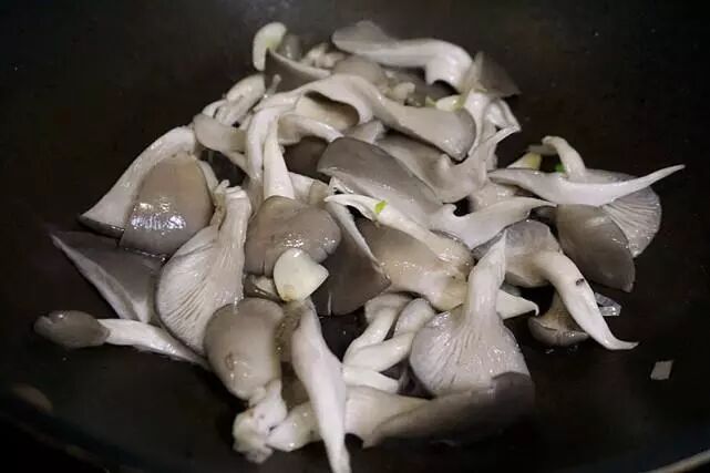 5、这时候转大火,放入平菇快火翻炒,这样可以逼出平菇里的水分。