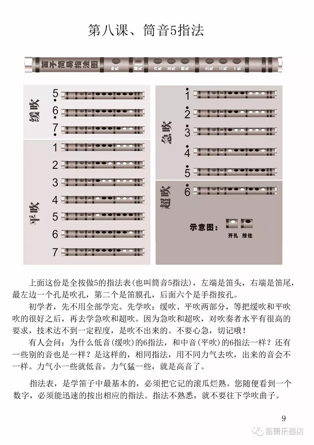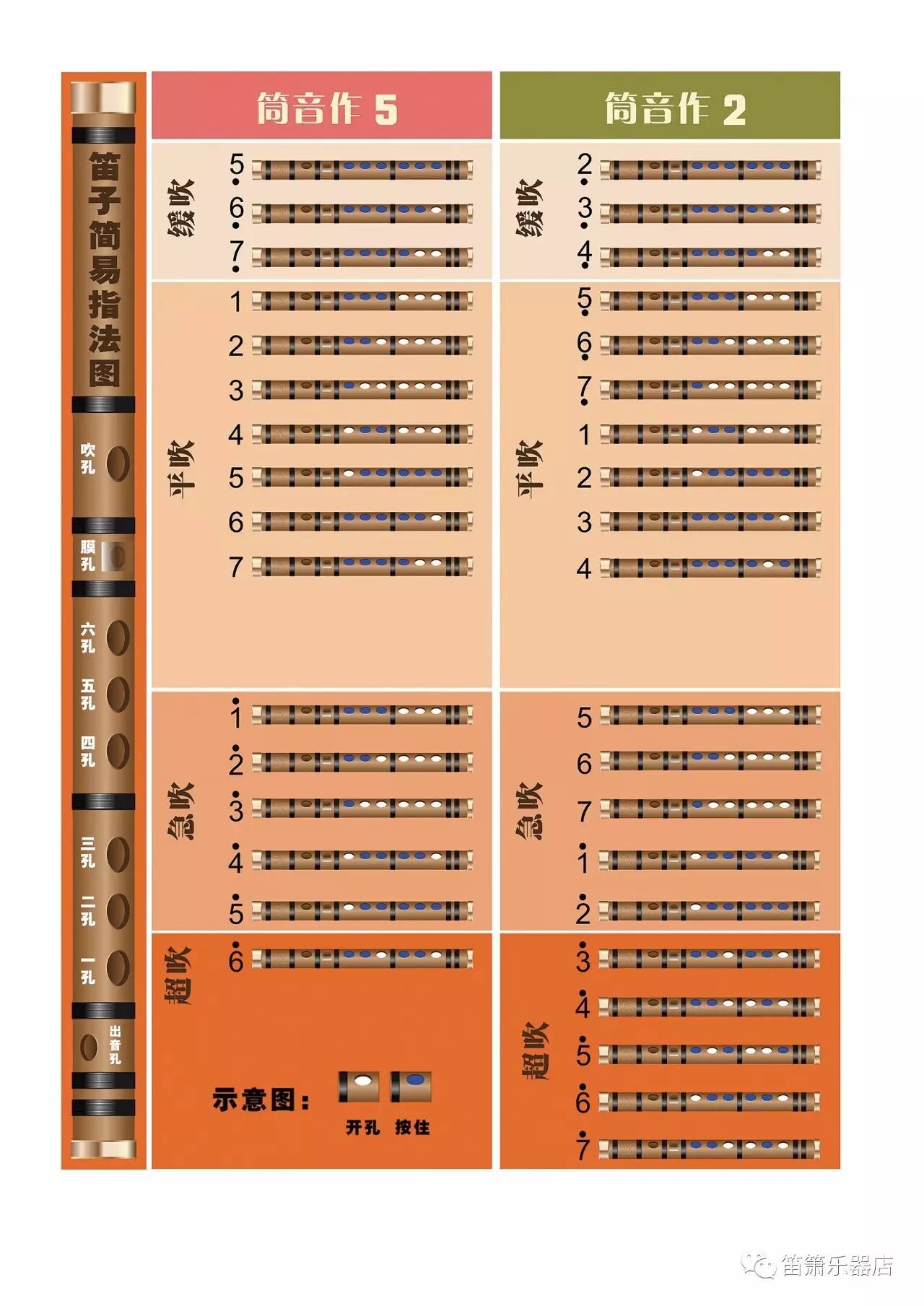 有的初学者,对指法这玩意不了解。以为要学会几种指法,才能吹曲子。其实不然,筒音5的指法,可以吹出大部分的歌曲,百分之七十左右的歌曲,都可以用筒音5的指法去吹。那既然这样,为什么还要学别的指法呢?大家看看:筒音5的指法,能吹出来的最低的音,是低音5吧?一支笛子,全部按住6个孔,吹出来的音是最低的,低于这个音就没办法吹出来了。也就是,筒音5的指法,只能吹出来的最低的音是低音5。也就是说一首歌曲中,从头到尾,没有任何一个音是低于这个低音5的,就可以用这种指法去吹。而如果歌曲中,出现低音5以下的音,比如低音4,或者低音3,又或者低音2,用筒音5的指法,就没办法吹出来了。这个时候,就要用筒音2的指法去吹了。因为筒音2的指法,能吹出来的最低音是低音2。举个例子,星月神话,这首歌曲,一开始前面两句,就出现了一个低音3,这样的话,筒音5指法就不合适了。不信您试试,用筒音5指法吹的话,低音3就会变成中音3了。因此,星月神话,只能用筒音做2的指法去吹奏。