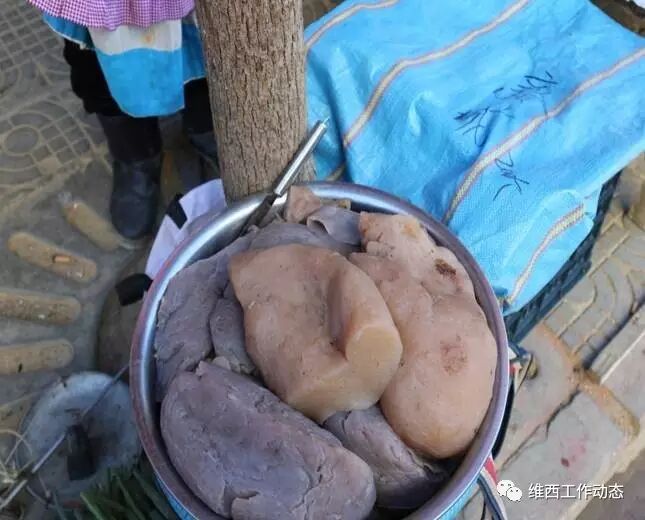 在维西,小年开始,空气中就开始飘起了年的味道,熙熙攘攘的人群、琳琅满目的各类年货、喜庆的灯笼和年画占据了大街小巷、角角落落,男女老少背着背篓穿梭在年货中,认真选购各类食材、各类过节物品期盼着春节的到来。维西人民喜欢美食,也非常重视年夜饭,不管再忙再累都要一家人一起搭帮手进行准备,几乎很少有人在外定做年夜饭,因为大家认为除夕就是团圆,一家人一起动手做出来的饭菜比什么都香。此外,在维西,人们习惯比较谁家年夜饭做得最快、吃得最早,寓意来年万事领先,因此,小年过后大家就开始忙碌着筹备年货,为的是来年讨个好彩头。说起维西的年味,要从年货开始。