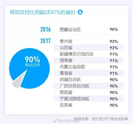 昨日(2日)支付宝发布2017年全民账单显示,10笔支付宝支付中8笔用手机,移动支付占比超90%省份超过11个,而2016年仅一个。