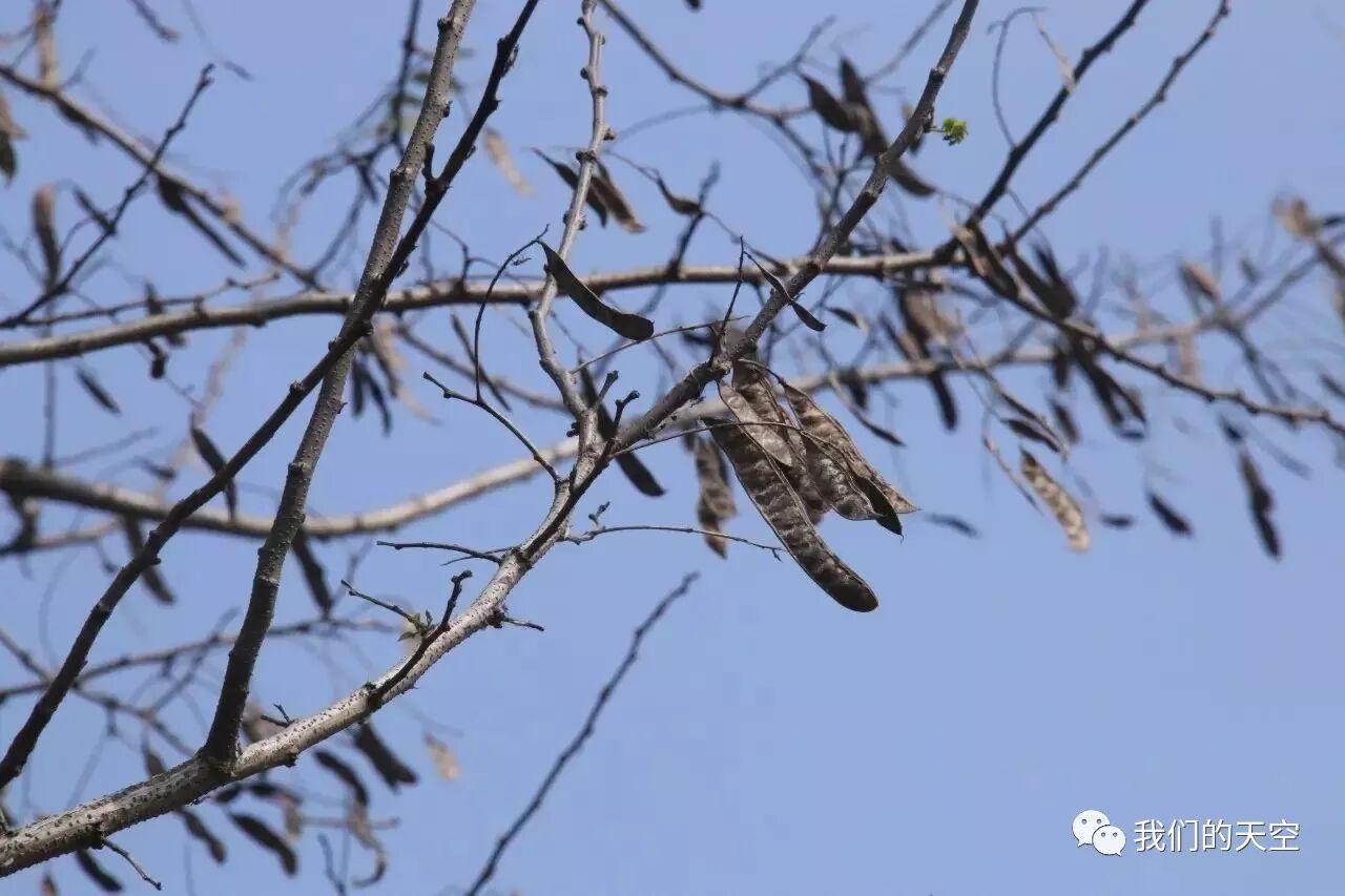 叶子落光之后,挂在枝头的一丛丛豆荚表示了刺槐豆科的身份。荚果由绿色变为赤褐色,荚皮变硬呈干枯状即为成熟。此时走在野外,能看到各种夹果挂在光秃秃的枝头。