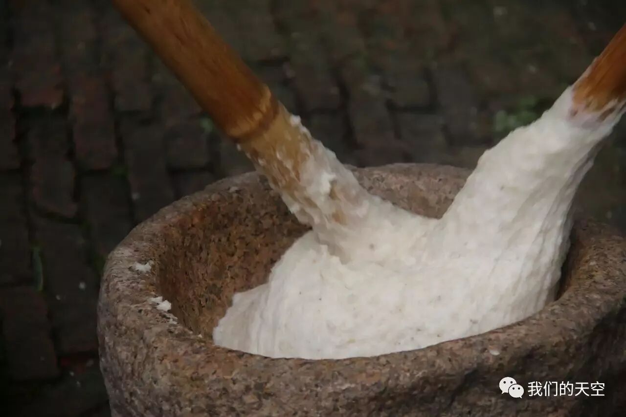 水稻收割结束后新谷进仓,就可以制作各种米食来庆贺丰收了。打糍粑是其中的力气活,需要将蒸得热气腾腾的糯米倒入石臼,然后使出全身的力气一下一下将米舂至绵软柔韧,趁热团成糍粑。在寒冷的冬日,咬一口香甜的糍粑,一年春种秋收的精华便尽在其中了。