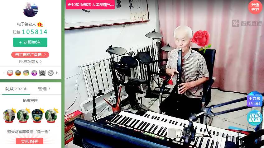 今天小编无意间看到一个名叫电子笛老人直播间,点进去发现是一位满头白发,但是精神矍铄的老爷爷在直播,老爷爷吹的电子笛真的很好听,悠扬,有味道!从中你真的能听出感情,和岁月的洗礼!老爷爷会的乐器还真的不少,电子笛,架子鼓,电子琴!这么大岁数还来给大家直播,也不得不说爷爷真的很潮,大家纷纷给爷爷点上关注!游客觉得这是繁星最干净的直播间。因为只有音乐和游客,爷爷也不会为了礼物什么的!为老爷爷这份情怀和精神点赞!!