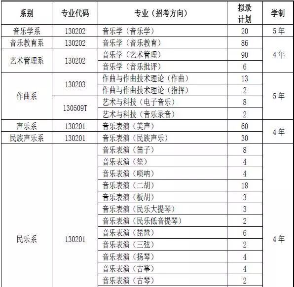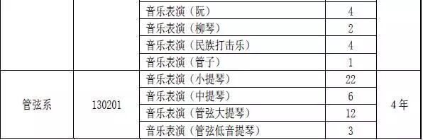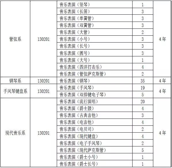 ①美声、民族声乐、笛子、笙、唢呐、二胡、板胡、民乐大提琴、民乐低音提琴、琵琶、三弦、扬琴、古筝、古琴、阮、柳琴、民族打击乐、管子、长笛、单簧管、双簧管、大管、小号、长号、圆号、大号、管弦萨克斯管、管弦低音提琴、西洋打击乐、手风琴、双排键电子琴、流行演唱、现代键盘、现代萨克斯管、爵士小号、爵士长号、爵士鼓、古典吉他、电吉他、电贝司、电子手风琴、音乐教育: