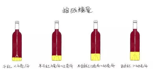 葡萄酒的酿造过程,即酵母将葡萄酒中糖分转化为酒精的过程。在酿酒的过程中,并非所有糖果会完全被酵母分解,会有部分糖残留下来,即为残糖量。残糖量不同,葡萄酒中的含糖量就不相同,干葡萄酒、半干葡萄酒、半甜葡萄酒和甜葡萄酒就是依据葡萄酒中含糖量的不同来进行的分类。一般来说,干葡萄酒的甜度最低,品尝时甜味不明显,半干葡萄酒在饮用后有微甜感。随着残糖量的提高,甜的口感逐渐明显。半甜葡萄酒饮用时有甘甜、爽顺感,甜葡萄酒则有明显的甜纯感。大家可根据自身的口感偏好,选择不同甜型的葡萄酒。