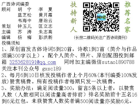诗人简介: 周恒胜,网名:瑟笛。系北宋著名哲学家、思想家理学派开山鼻祖周敦颐(号元公)第二十六代嫡孙。原籍广东省开平市,现居住湖南省株洲市。1959年3月生人,汉族。在广铁集团直属长沙客运段工作。从事诗词歌赋创作四十余年,曾自创了“瑟笛文学社”,“瑟笛草堂”等网络文学团体。致力于网络文学和古诗词的推广应用和研究。其作品散见于中华诗词论坛、诗词吾爱、广东五邑网、达人文学、东方诗书画论坛等。各类诗词诗歌两千余首。曾多次应邀为《广州铁道报》撰稿。并且被广铁集团特殊人才库入档案。现为《华夏诗词论坛》“潇湘文苑”版首席版主。 七律.岁末书怀 文/瑟笛 岁又严冬腊月时,斜阳向北问梅枝。 江高岸广寒风朔,水浅舟轻碧浪怡。 楚雨侵人萧瑟瑟,渔家煮酒暖滋滋。 漫谈南岳松端雪,不筑村中院落篱。 七律.盼春归 文/瑟笛 岁煮浓冬又夜阑,松枝裹素尽泥丸。 风吹峻岭孤舟冷,雨打湘江两岸寒。 万里烟云花更少,三千陌野草枯残。 欲求春梦芳华景,好让蓝天紫燕盘。 步韵和梁智华先生《观赏“悦女人悦旗袍”优雅盛典感赋》 文/瑟笛 发髻疏云泛洞天,佳人粉黛若飞仙。 轻移莲步展鸿运,媚舞娇姿述锦篇。 领袖添龙留香韵,胸襟绣凤竞华妍。 今朝有幸观妖蝶,畅想人生数梦牵。 五律.题胡杨 文/瑟笛 与漠追风月,观沙逐岁寒。 春陪原上草,冬守玉门端。 令雁传秋意,留驼应夜阑。 长时随处寄,朽后化泥丸。 酒陪同道饮; 吾借故乡飞。 五律.与友一行上君山 文/瑟笛 酒陪同道饮,诗为故乡挥。 远客随春醉,知音信步依。 坐谈云梦泽,观赏岳阳矶。 斑竹名悠远,皆因舜帝妃。 荷红花世界;柳暗绿长堤。 五律.株洲市湘江空灵隐秀 文/瑟笛 向北湘江水,投南曲尺溪。 荷红花世界,柳暗绿长堤。 总看桑洲走,常闻白鹭栖。 老城多丽景,更想过河西。 注:曲尺,桑洲均为湘江上株洲段的地名,有一定的历史述说。 七绝.盼君归 文/瑟笛 新年又是楚升晖。欲问佳人何日归? 玉笛横吹愁总是,寒窗苦守望香妃! 七绝.与君同乐 文/瑟笛 君子之交陌路间,知音格物肯登攀。 坦然追梦书香里,不觉人生峻秀环。 七绝.天涯远 文/瑟笛 情浓水淡月盈窗,夜幕深沉举酒缸。 遥望银河星几坐,香君已过万条江。 七绝.情牵不倦 文/瑟笛 情牵塞北恨天寒,独坐阳台睹夜阑, 期盼佳人归日早,书生浅爱梦均安。 七绝.问世人虫谁又是 文/瑟笛 坐井观天自认龙,花开半夏却招虫。 无知小鸟流云水,化入荒芜乱岗中。 七绝.当今乱象 文/瑟笛 迷恋红尘花变态,悯相蛇蝎自多情。 寻芳市井无根底,醒悟才知泪水横。 破阵子.数九寒冬说梦 文/瑟笛 天阙飞花落岭,人间煮酒吟诗。 纵有寒风摧梦想,还要宽怀话此时。 隆冬留首词。 点烛倚床熬夜,沏茶入盏冥思。 一点凄凉愁绝意,拙笔功书雅韵追, 但求梅做妃。 曲玉管. 文/瑟笛 玉宇归寒,神州凛冽,烟波浩荡谁都晓。 北去湘江疏岸,南岳娇娆,舸船漂。 爱晚藏香,韶峰招魄,家乡万众同哀掉。 领袖仙游,驾鹤飞去云宵。后人聊。 历史回眸,看多少、风流人物, 唐宗宋祖康熙,毛翁略显风骚。 赛羲尧。 望江山灰暗,惹起书生词赋, 笑谈今昔,思念天娇,痛恨人妖。 |
