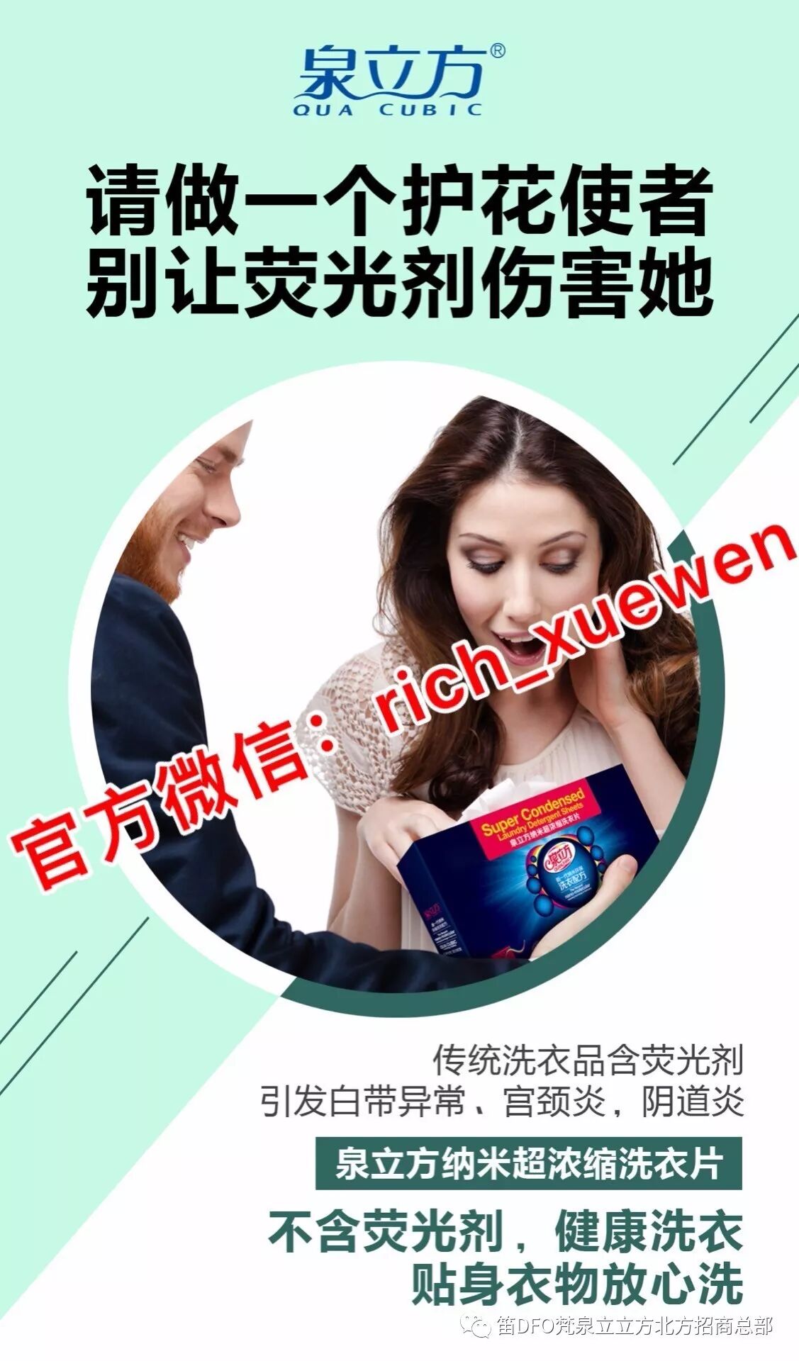 泉立方洗衣片不含磷,不含荧光剂、不含碱性盐!泉立方采用的是纳米超浓缩技术,PH值中性,洗衣片洗过衣服的水都是无害的,可以用来浇花,养鱼!不管洗的婴幼儿的衣服、还是贴身衣物都可以放心使用!咨询官方招商微信:rich_xuewen