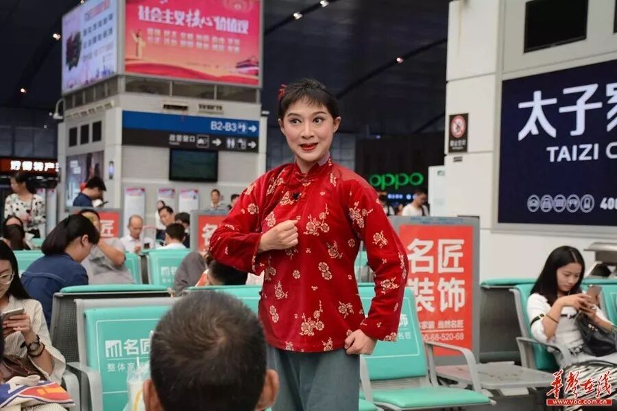 原来,这是湖南省京剧保护传承中心联合长沙火车南站策划的一场庆祝建国68周年的“祝福祖国 京剧‘快闪’”活动。