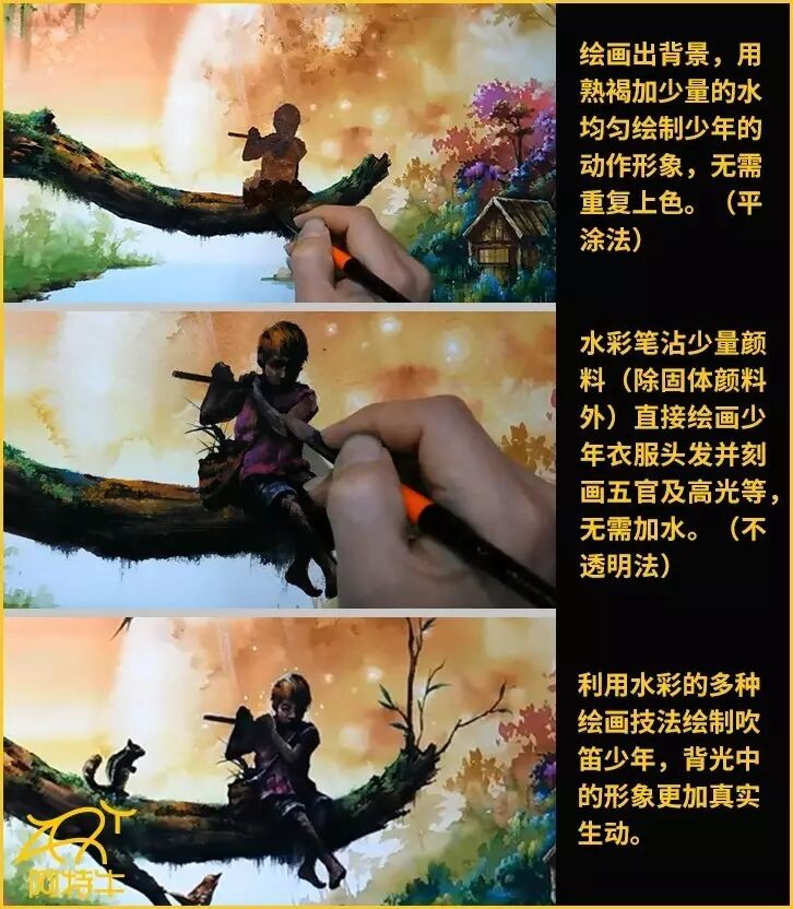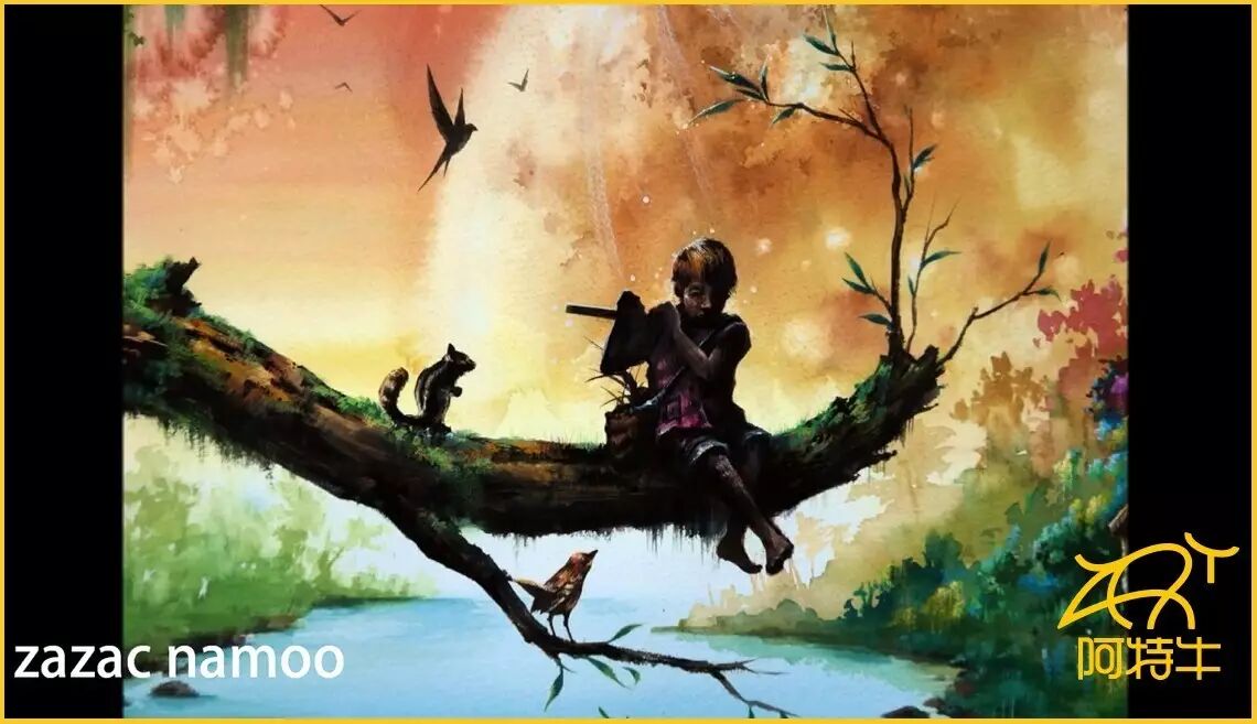 艺术家zazac namoo用水彩的多种绘画技法创作了一幅吹笛子的少年场景作品,下面是他的绘制过程。