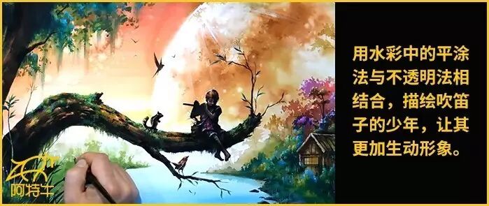 4、刻画主体:画面中的主体物是少年,用平涂法与不透明法相结合刻画出少年吹笛子的形象,注意逆光的表现,最后完成创作。