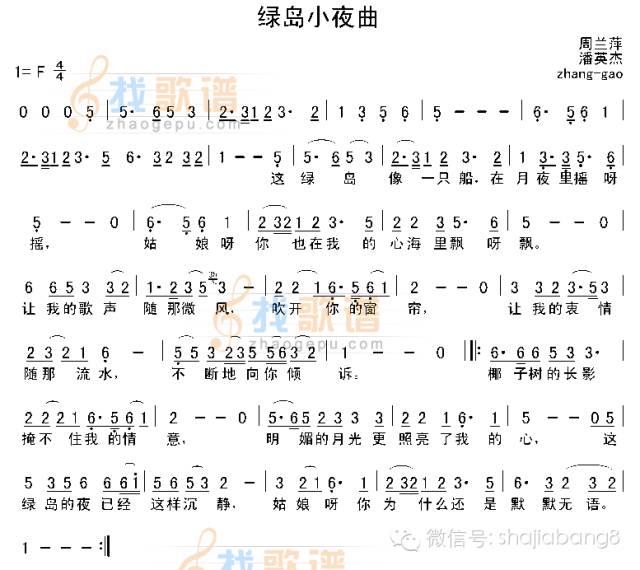第二天潘英杰就把交给周蓝萍,正处热恋的周蓝萍看了相当满意,有深获我意之感,在爱情甜如蜜的企盼下,立刻谱成《绿岛小夜曲》。这是一首以“绿意盎然”的台湾景观为背景,描写恋爱中男女的患得患失、起伏不定的心情,之后歌曲一唱而红,至今流行不衰。