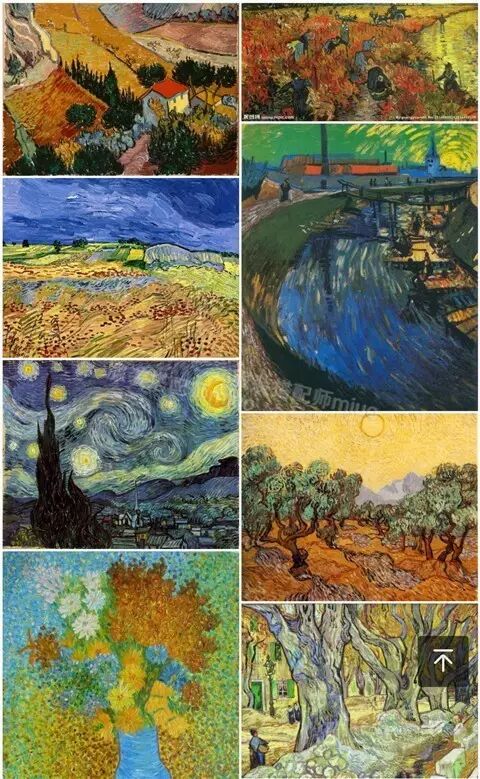 梵高的撞色,和莫奈的撞色感觉完全不同,莫奈很浪漫,梵高热烈又奔放。