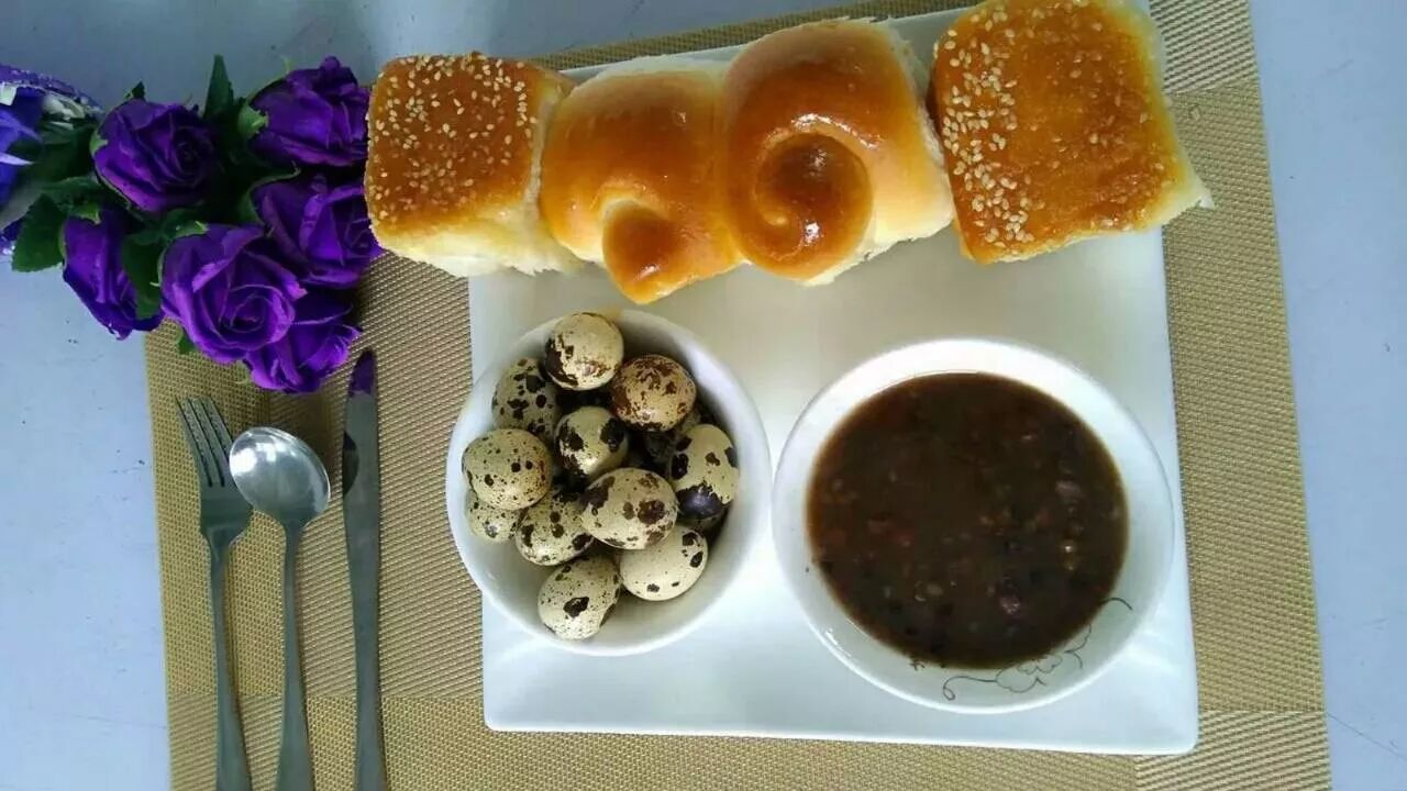 鹌鹑蛋,蜂蜜小面包,八宝粥