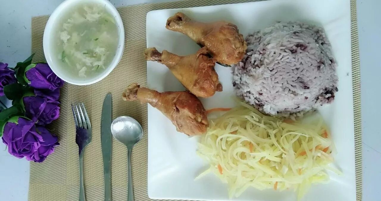 红烧琵琶腿,清炒土豆丝,双色米饭,黄瓜鸡蛋汤