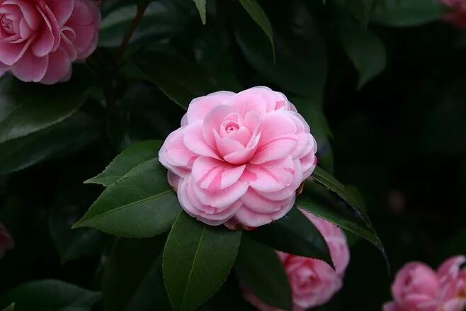 山茶花生于南国开在隆冬,农历的十一月当严寒覆盖了大地,而山茶花却依然凌霜傲雪兀自绽放,敢于同斗雪的腊梅媲美。其娇柔而坚定的风姿,葱郁盎然的生机,令人在料峭的寒风里读到了春的讯息。
