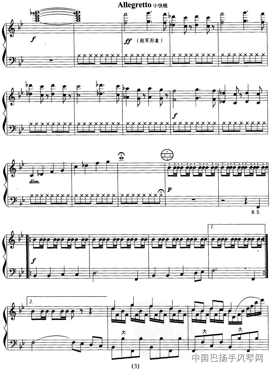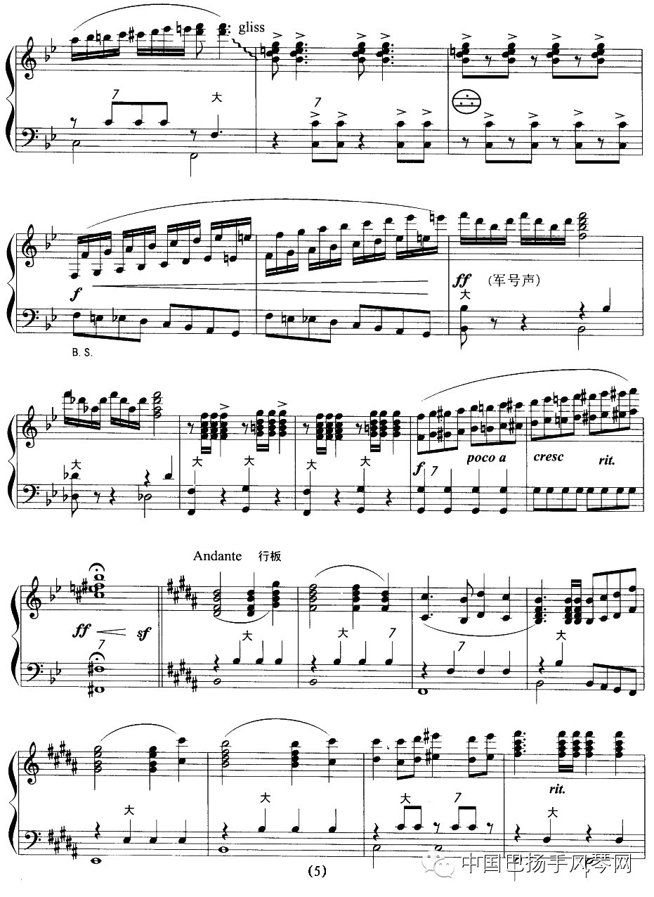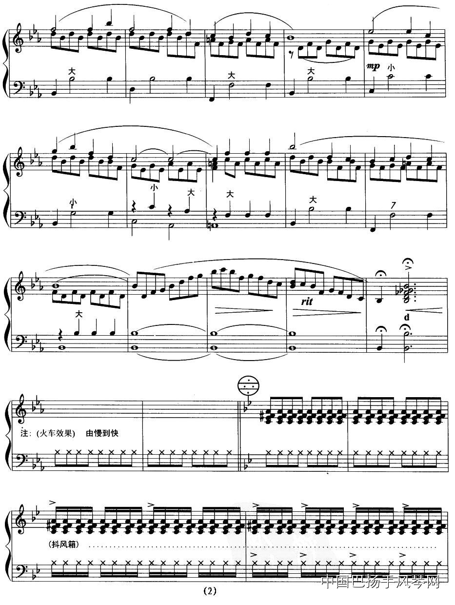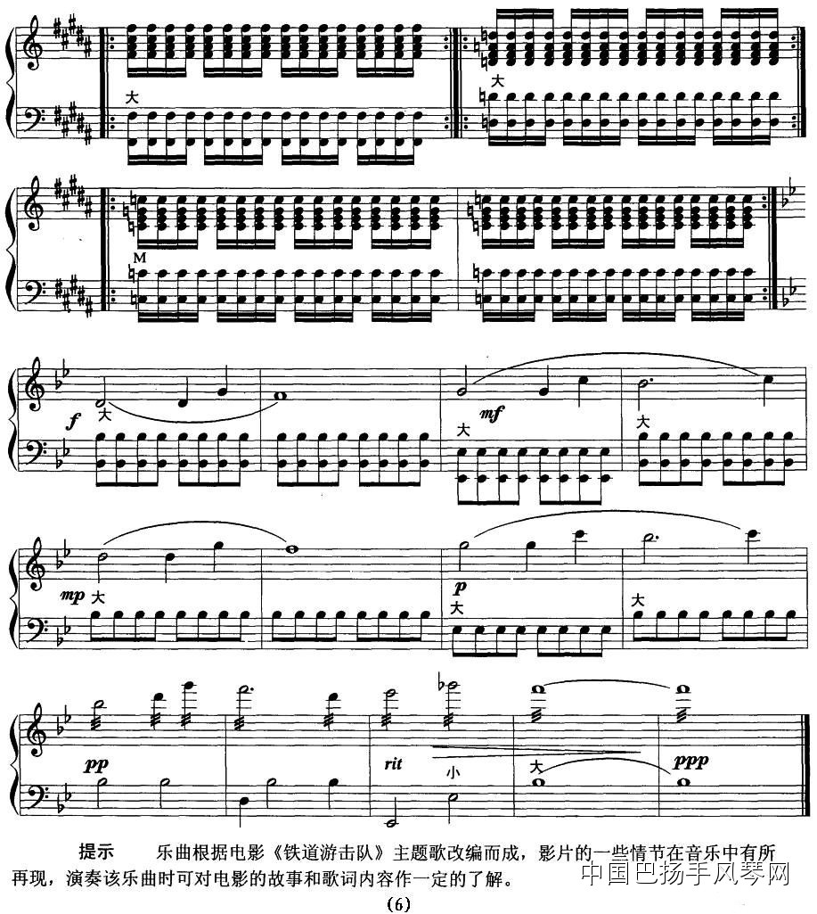5.欢庆胜利:丰满的和弦重奏营造出了战士凯旋的画面,半音阶越来越强是人民群众敲锣打鼓的欢腾场面。
