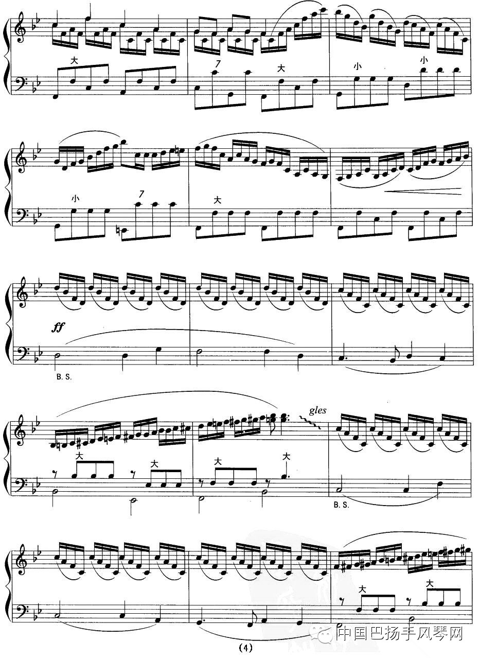 而针对第3和7小节可以在技巧角度两次使用gliss(滑奏),一是为了渲染热烈、欢快的气氛,二是烘托全曲从低到高、从弱到强的连贯流畅情绪。特别注意的是,在运用滑奏时肩膀、手臂要松弛,只用手指刮键盘,力度保持在刚好将琴键压到底。