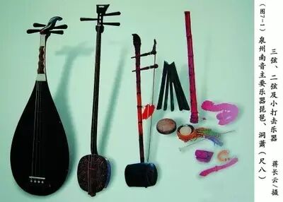 许多专家认为,南音的源头与古代宫廷、贵族音乐密切相关。南音的乐器主要有横抱曲颈琵琶、十目九节洞箫,以及二弦、三弦、拍板等十多种。弦管演奏时,右侧琵琶、三弦,左侧洞箫、二弦,和谐地合奏古曲,或为居中执拍板而歌者伴奏,尽显古朴优雅。