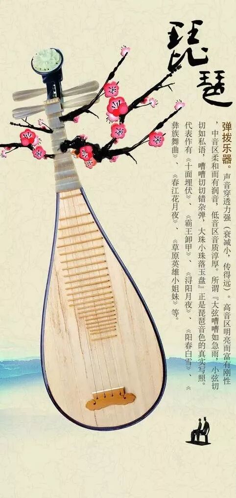 琵琶传统上是五声音阶,目前标准的琵琶已有八相三十品,琵琶表现力和适应力大大加强,不仅可以演奏传统乐曲,而且可以演奏西洋和现代作品,并且有利于与交响乐队合作。著名乐曲有《十面埋伏》、《霸王卸甲》、《汉阳月夜》、《阳春白雪》、《月儿高》, 协奏曲《草原英雄小姐妹》等,均广泛流传,深受人民的喜爱。唐代诗人白居易在他的著名诗篇《琵琶行》中写到:“大弦嘈嘈如急雨,小弦切切如私语。嘈嘈切切错杂弹,大珠小珠落玉盘'。可见琵琶的演奏及其音响效果的奇妙。