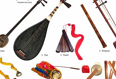 ②下四管乐器有南嗳(中音唢呐)、琵琶、三弦、二弦、响盏、狗叫、铎(木鱼)、四宝、声声(铜铃)、扁鼓,共十种,故又称“十音”。在惠安一带有用云锣、铜钟、小钗和笙等。