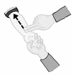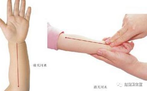 天河水穴采用推法,推天河水穴;食指,中指两指并拢,自腕横纹推向肘横纹(向心性推之),称清天河水。用力要均匀,向前推动不要歪斜。推5~15分钟,1000~3000次。