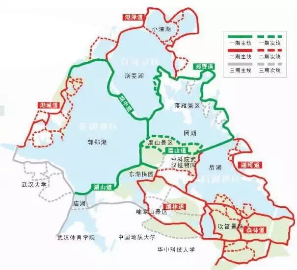 绿道二期选线充分吸纳公众意见和建议,主题绿道将与一期无缝对接,串联磨山景区、听涛景区、落雁景区、武汉植物园以及马鞍山森林公园,包括环郭郑湖、汤菱湖、后湖三大部分。规划形成5段12景结构,打造湖城道、湖泽道、湖町道、森林道、湖林道五条主题绿道,全长73.28公里。