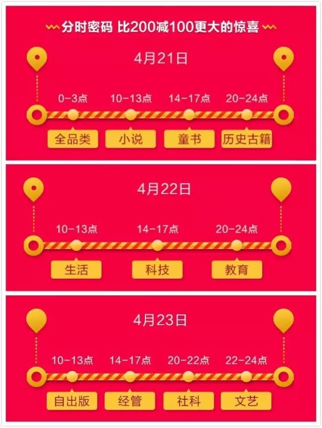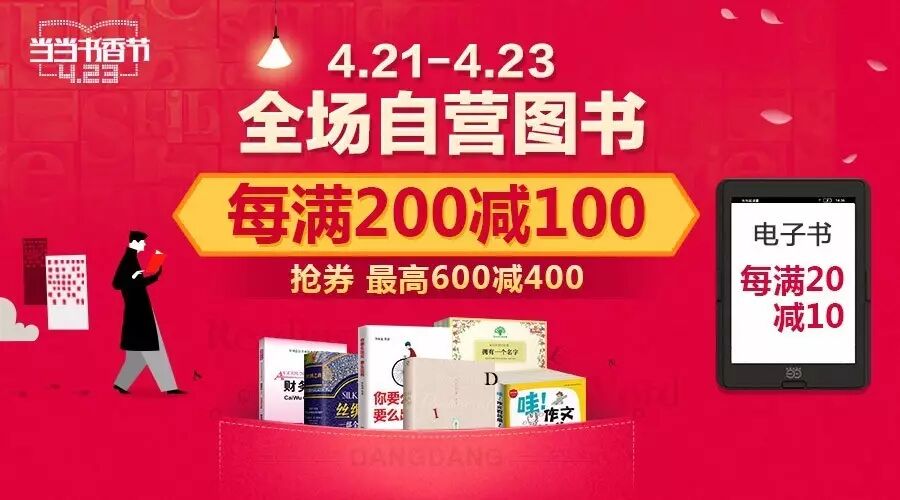 4月21日至23日,每天0点,10点,14点,20点,共计4波,满300减100图书礼券继续抢!礼券数量有限,先到先得,请注意每波礼券使用有效期3仅个小时,过期失效。礼券可在满减基础上叠加使用,叠加满减后相当于满600减400。